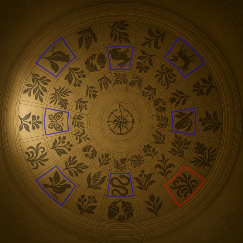 When the motifs are divided into animals and plants, a rule becomes apparent in the placement of the animals. Only one section, marked by the red frame below, breaks this rule.